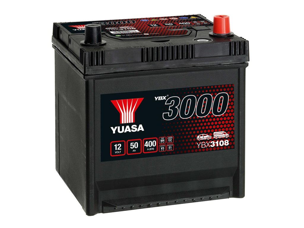 YBX3108 12V 50Ah 400A(EN1) karbantartást nem igénylő YUASA autóakkumulátor. Importőre a MICRONIX Hungary Kft..