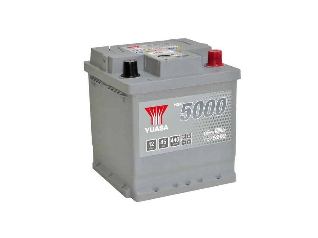 YBX5202 12V 45Ah 440A(EN1) karbantartást nem igénylő YUASA autóakkumulátor. Importőre a MICRONIX Hungary Kft..